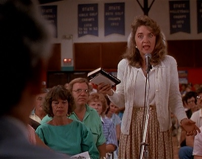 Also, a “conservative” caricature uses an onslaught of personal mockery to try to intimidate Ray’s wife at the meeting, rather than saying anything substantive in her arguments. In my experience, personal insults are usually a tool of progressives, not conservatives. It’s easy for Ray’s wife to tear down this caricature and herd the sheep in the audience to her side because her opponent is not offering anything of value. Watching this scene again after all these years, I realized it is not a triumph of the Constitution over Nazism, but it is simply a straw-man argument taken to an absurd degree.