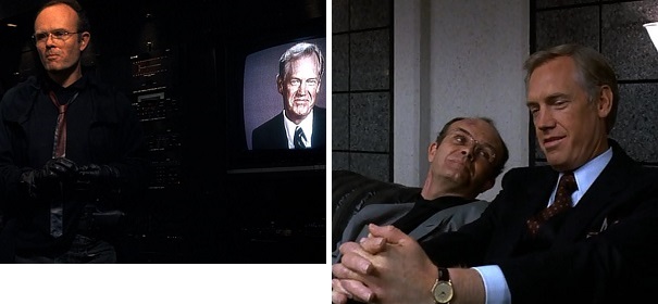 Here’s another mirrored symmetry in that scene – in the ED-209 demonstration ED-209 threatens to shoot the jr exec due to his faulty programming (done by Dick Jones’ team) and Dick Jones scrambles to prevent it and fails and the jr exec is shot and killed. In the mirror scene Dick Jones counts on the faulty programming that his team put into RoboCop to prevent RoboCop from shooting him. The CEO / Chairman scrambles to fix RoboCop’s programming and succeeds and Dick Jones gets shot to death.