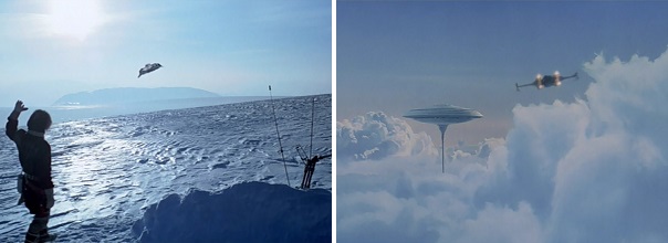 A squadron of snowspeeders flies over Hoth’s terrain to rescue Han and Luke. Later, Luke flies toward Cloud City to rescue Han, Leia, Chewie, and Threepio.