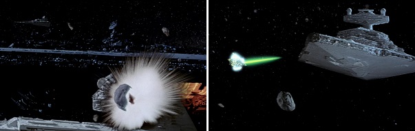 A Star Destroyer gets destroyed by an asteroid, demonstrating the dangers of the asteroid field. Later, a Star Destroyer is shown blasting its way through several asteroids, demonstrating that they’ve figured out how to overcome the danger they’re in.