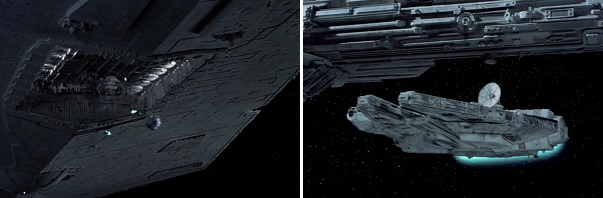 After the opening title crawl, the first thing we see is a Star Destroyer launching a whole bunch of probes from its underbelly in search of Luke Skywalker. Just before the end credits roll, we see the Millennium Falcon detach from the underside of a Rebel medical frigate and go off in search of Han Solo.