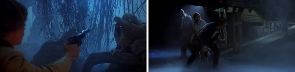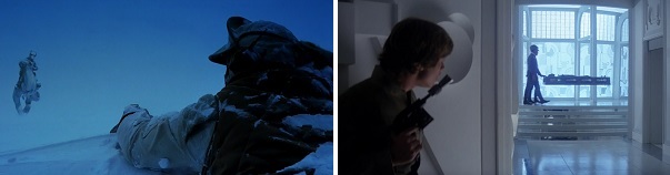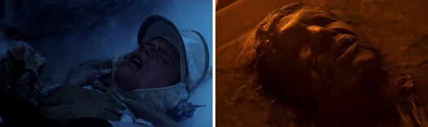 On Hoth, Han stumbles across Luke’s seemingly lifeless body in the snow. On Bespin, Luke stumbles across Han’s frozen body being carted away in carbonite.