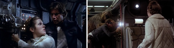 Han interrupts Leia’s work repairing the ship and the two share a romantic kiss. Threepio butts in, happily sharing something trivial he accomplished while Leia hurries away. Later, Threepio tries sharing an opinion, but Han says he’s not interested. Suddenly, Leia comes running up to Han, who’s busy with a repair. He walks away from her to deal with the problem, and she winds up going with him. There’s no time for a romantic moment, unless you count the mynock kissing the Millennium Falcon’s window.