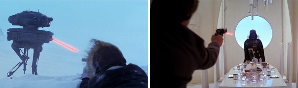 An Imperial Probe reveals the location of the Rebels’ hidden base on Hoth. Han shoots it with his blaster and it self-destructs. On Cloud City, Han, Leia, and Chewie are ambushed by Vader after being sold out by Han’s friend, Lando. Han shoots at Vader, but is quickly disarmed.