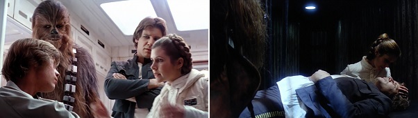 Back at the Rebel base, Han and Leia are relieved to see Luke recovering from his wounds sustained in the snow creature’s attack. In a prison cell, Leia comforts Han after he’s been tortured.