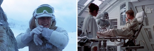 The first time we see Luke, he radios Han, telling him he’s going to check out a meteorite that crashed in the distance and he won’t take long. But he’s interrupted by a snow creature that roars in his face and attacks him with its giant arm. The last time we see Luke, he radios Lando Calrissian (who’s wearing Han’s clothes) and tells him he’ll be waiting for their signal as they head out to look for Han. Chewbacca gives a melancholy growl. Then Luke gets poked by a medical droid who’s helping him recover feeling in his new robotic hand.