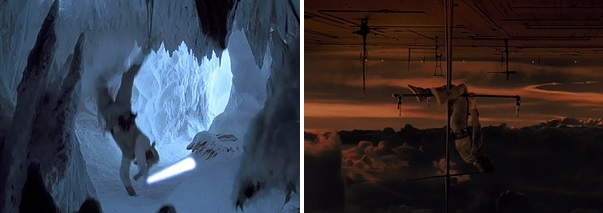Luke uses his lightsaber to cut the ice holding him in an upside-down position and he falls to the ground. Later, he falls down a huge shaft and winds up stranded upside down beneath Cloud City.