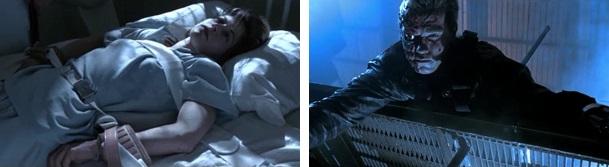 The Terminator stitches Sarah’s shoulder wound shut. She got that wound from a fight with the T-1000.