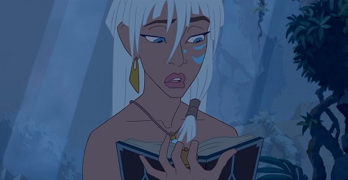 Kida shows Milo writings that are inscribed in stone underwater. He is able to translate them to help explain more about her heritage. She’s illiterate, so this is illuminating for her.