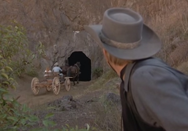Cactus Jack paints a tunnel entrance into the side of a mountain, just like Wile E. Coyote.The movie is packed with pure Looney Tunes-style gags. I kid you not, at one point Cactus Jack actually paints a tunnel entrance on the side of a mountain and Handsome Stranger rides right through it. But when Cactus Jack tries to follow him, guess what happens. He crashes into solid rock. If that’s not Looney Tunes logic, I don’t know what is. I mean, compare that to this scene from a Wile E. Coyote cartoon: