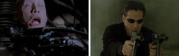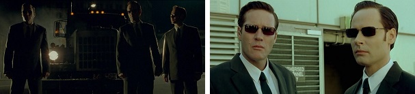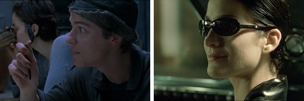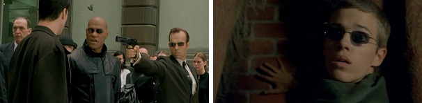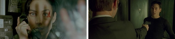 And Trinity blows an agent’s brains out just as he is about to kill Neo.