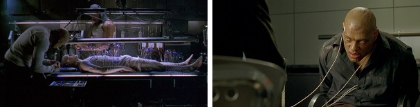 Trinity sucks the tracking device out of Neo’s stomach just as it threatens to get away.