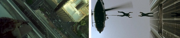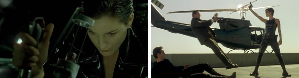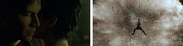 Neo returns the favor when he saves her life by pulling her from a falling helicopter just before it crashes into a building.