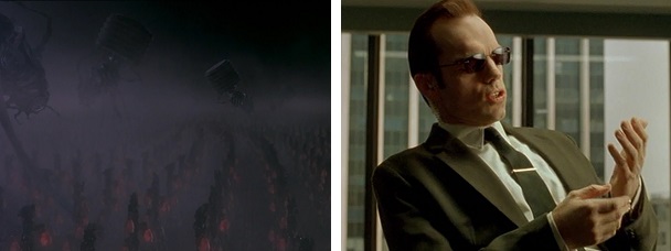 Agent Smith mocks Morpheus by describing humanity as a virus that is never able to find an equilibrium with its natural surroundings. Machines, he believes, are the cure.