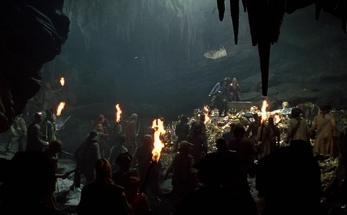 During their initial escape from Lo Pan, Burton’s sort-of romantic interest Gracie Law stops to look at something strange. There’s an odd-looking statue against the wall and we see a pair of monstrous eyes hiding behind it. As Gracie looks at those eyes, the statue opens up and a hand reaches out and grabs her and pulls her down to meet Lo Pan. Lo Pan realizes she has green eyes, so he plans to marry her as well and then kill her while leaving Wang’s fiancé alive. This will satisfy the curse and also leave him free to enjoy himself.