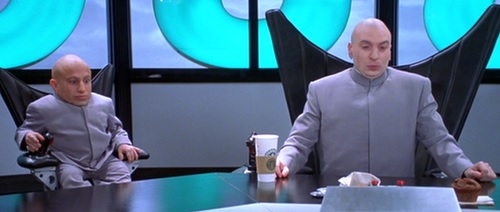 One of Dr. Evil’s double-agents steals Austin’s mojo by drilling into the crotch region of Austin’s frozen body.