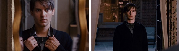 Peter does several things he’s never done before. He changes the way his hair hangs down and shouts at his landlord Mr. Ditkovich in response to being asked for rent. He never would have done those things in Spider-Man 2 when he silently bore his misery. Realizing that he’s changed for the worse, he removes his black Spider-Man suit and puts it in a chest in his closet.