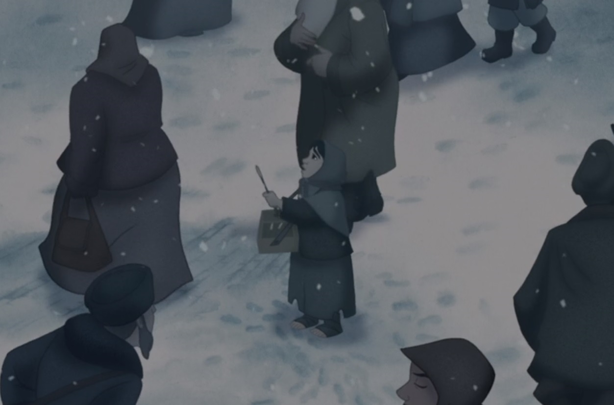 This little girl, who no one else paid any attention to, finally gets to feel the warmth of human kindness as the grandmother picks her up and carries her away from that forsaken alley. But as she does so, we see the little girl’s dead body remain behind, still slumped over in the snow. She froze to death after a short, cruel life devoid of love.