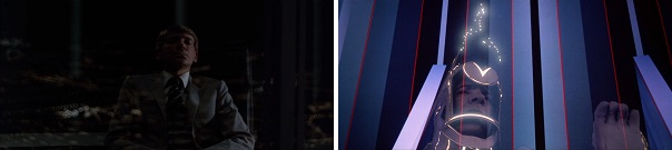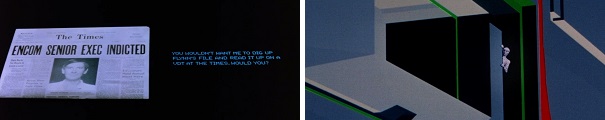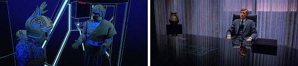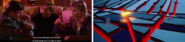 Dillinger rides to his office in a red-lighted helicopter and then proceeds to speak with the MCP. They scheme to block Flynn’s access to sensitive files because both their fates are intertwined.