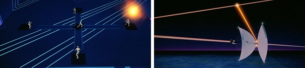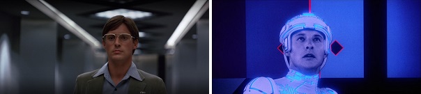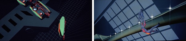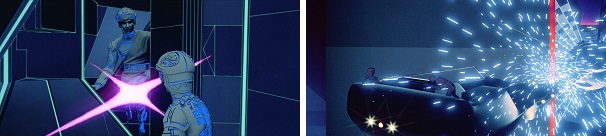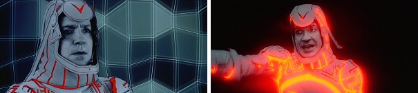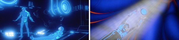 At Flynn’s first introduction to Tron, he mistakes him for Alan, his user. Tron says his user wants him to defeat the MCP, and Flynn says he already knows that. Flynn knows too much to be a simple program, but he just hints that he may be a user. Then he, Tron, and Ram defeat three red opponents in a game of “Lightcycle.”