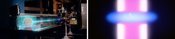 Lora and Walter prepare to shoot a laser beam at an orange to digitize it. Lora seems to have doubts about it, but Walter is confident it will work. In fact, it works perfectly, and Alan congratulates them on their success.