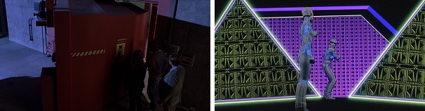 Alan and Lora are at a loss when it comes to how to open a huge backdoor to ENCOM. Flynn comes through with a fabricated ID card, which he uses to open it. Alan wryly remarks that he’s a lot like Santa Claus. Then they make their way past the door.