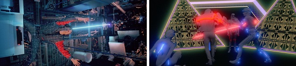 While Flynn goes through orientation, he asks about a lone blue warrior facing off against four red opponents in a disk battle. He’s told that it’s Tron, who fights for the users. Tron makes one of the red programs hit his own guy and then bests the rest of his opponents. In the end, he holds up his identity disk in victory.