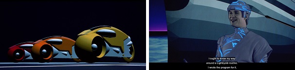 T. Reuniting with Tron, Flynn admits to being a user and writing the “Lightcycle” game