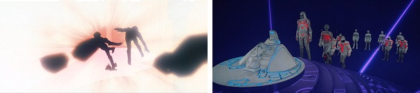 After escaping to a small ship, Tron fights off a bunch of red programs attacking him with staffs. During the fight, Tron accidentally knocks Flynn down, nearly to his death. Meanwhile, Yori helps their commandeered butterfly-like ship go faster to outrun Sark’s command ship, at least for a while.