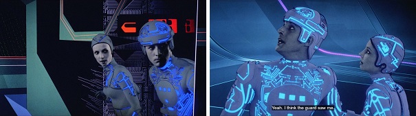 Tron and Yori climb around on large pipes. She slides down first into an area close to Dumont. Before Tron can slide down, though, a Recognizer spots him.