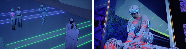 Flynn notes that he’s where Tron was heading, but he can’t find Tron anywhere. He hides above a group of red programs walking in formation. As they go by, he jumps down and knocks out a straggler. No one notices, and Flynn inadvertently receives that program’s red color on his own suit. So now he’s able to escape detection as he keeps looking for Tron.
