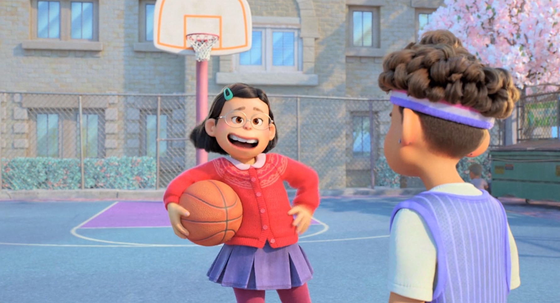 Turning Red opens with Mei’s explanation of how she balances her own needs with the needs of her family. She’s an overachiever in school. For some reason, the film shows students talking to the camera as if they’re being interviewed, but we never find out by whom or why. At the end, Mei grabs a basketball out of the air and shoots it, completely missing the basket and accidentally throwing it into the street where it gets run over. I suppose that’s to show that she’s out of balance and her attempts to subvert her own wishes will fall flat. Or it could just be a silly gag devoid of meaning.