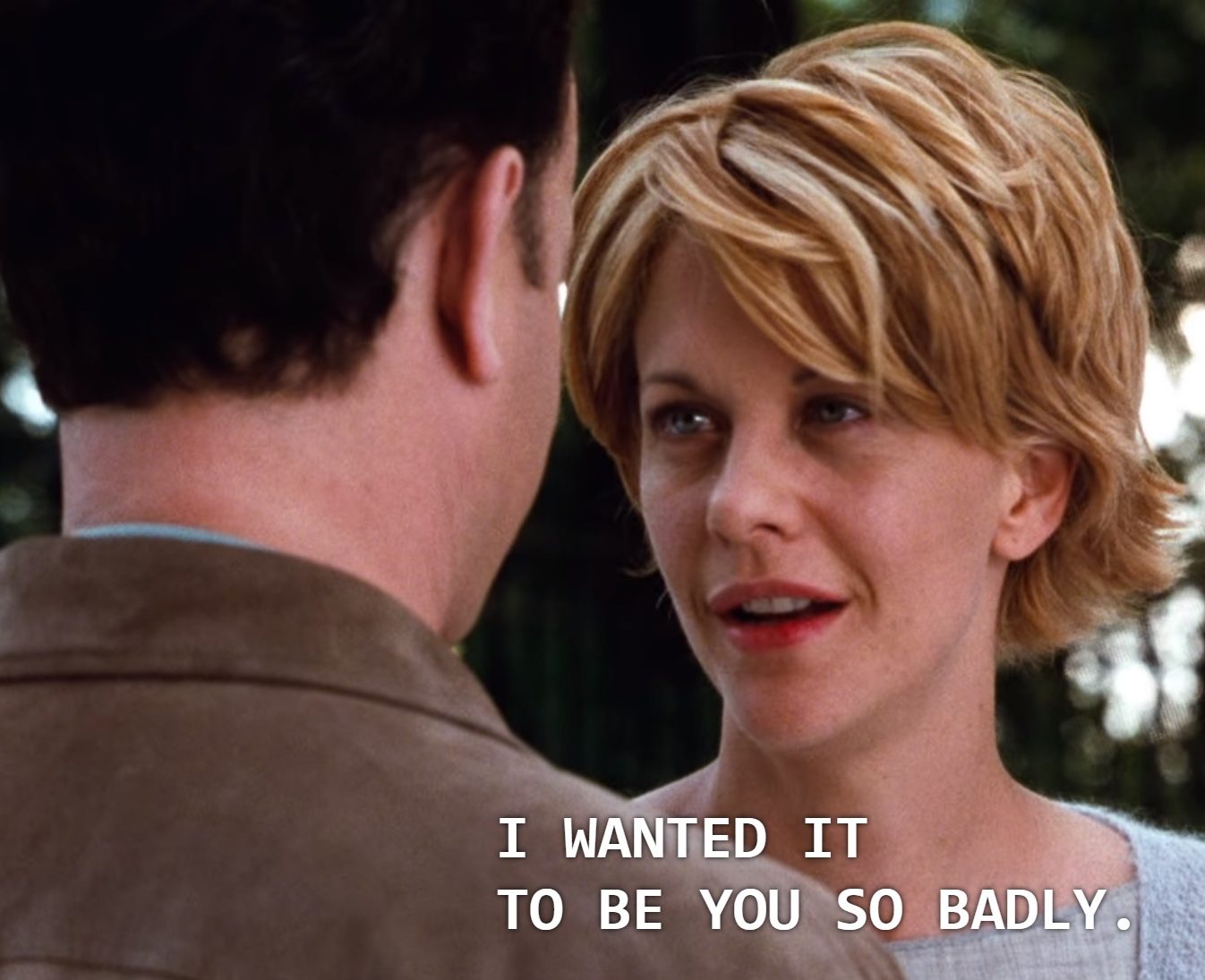 The main frustration with the show is that the two leads are in love, but they don’t know it because they each love a different side of the other. They’re stuck in a perpetual holding pattern as they fly in circles around each other. A two-hour movie doesn’t have the luxury of allowing that to drag on for more than 100 episodes. It has to get down to business fairly fast. So I’d like to present how You’ve Got Mail accomplished the impressive feat of getting its two romantic lead characters to fall for each other’s public and secret sides.