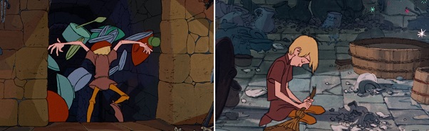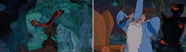 As squirrels, Wart finds a handsy girl admirer, and Merlin finds one himself. At first, it’s all fun and games, but a wolf comes and threatens to eat Wart. Wart’s squirrel girlfriend comes to the rescue and helps him get out of that dangerous situation. After Wart becomes human again, the poor squirrel’s heart breaks when she sees the truth that he’s not really a squirrel after all.
