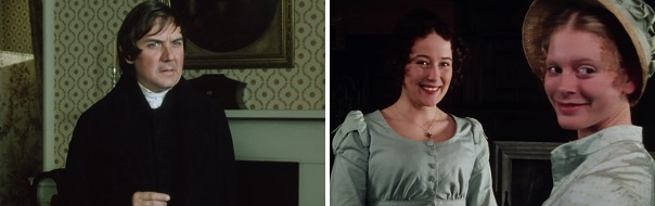 Mr. Collins explains, in excruciating detail, all the steps he plans to take to get from Hunsford to Longbourn to visit his cousins. He arrives in a carriage, and Mr. Bennet welcomes him at the expected time. We get a good look at his smiling face as he clumsily makes his way down to the ground. Mr. Bennet and Elizabeth manage to disguise their distaste for Mr. Collins during dinner.