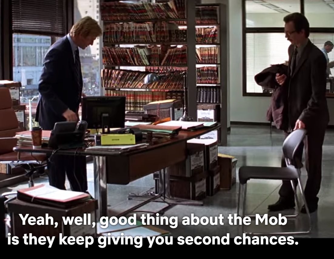 Harvey: “Yeah, well, good thing about the mob is they keep giving you second chances.”