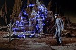 A. The crew of the starship C-57D approaches the planet Altair IV to look for survivors of a previous mission after going into bright-blue beams to protect them