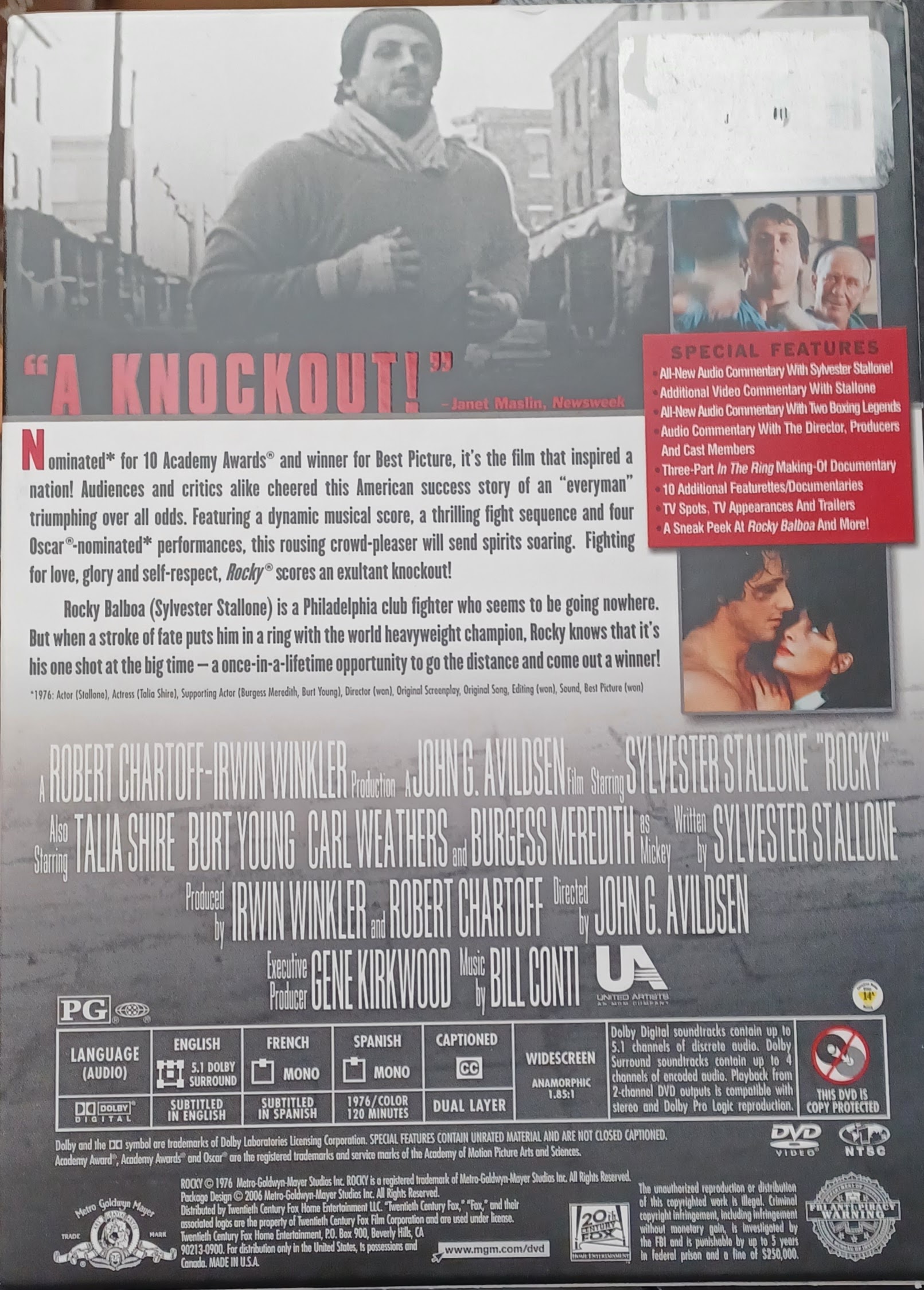 I have a 30th anniversary DVD of Rocky. It’s not connected to the other films in the series, so it’s free to emphasize the strengths of that first entry. The first paragraph on the back speaks to its legacy, musical score, and 10 Academy Award nominations and Best Picture win. The second paragraph briefly describes the plot. It takes it for granted that someone looking at this film is well acquainted with the story, so they don’t need to rehash those details. It also briefly mentions that there’s a sneak peek at a sequel called Rocky Balboa, which debuted in 2006. But that’s not the biggest selling point of this version.