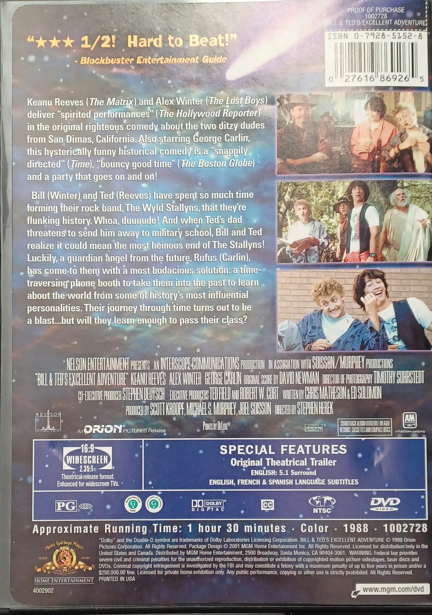 Bill and Ted’s Excellent Adventure is a very good film. I have a DVD of it with a quote from a critic saying, “3 ½ Stars! Hard to Beat!” That’s a nice shorthand, explaining that this film is more than it might appear to be at first.