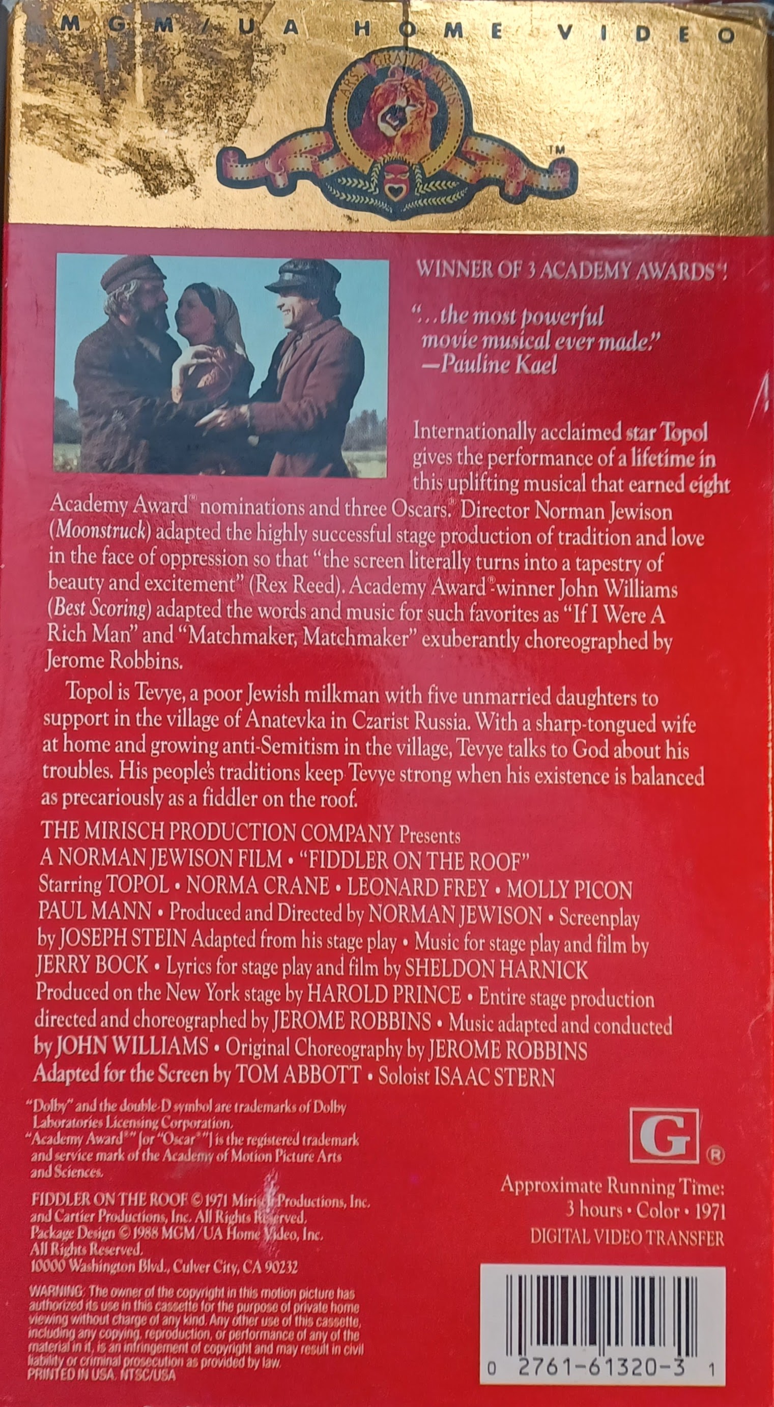 My copy of Fiddler on the Roof highlights John Williams’ role in orchestrating the film before he became a household name. It also praises actor Topol’s performance as Tevye and sums up the story.