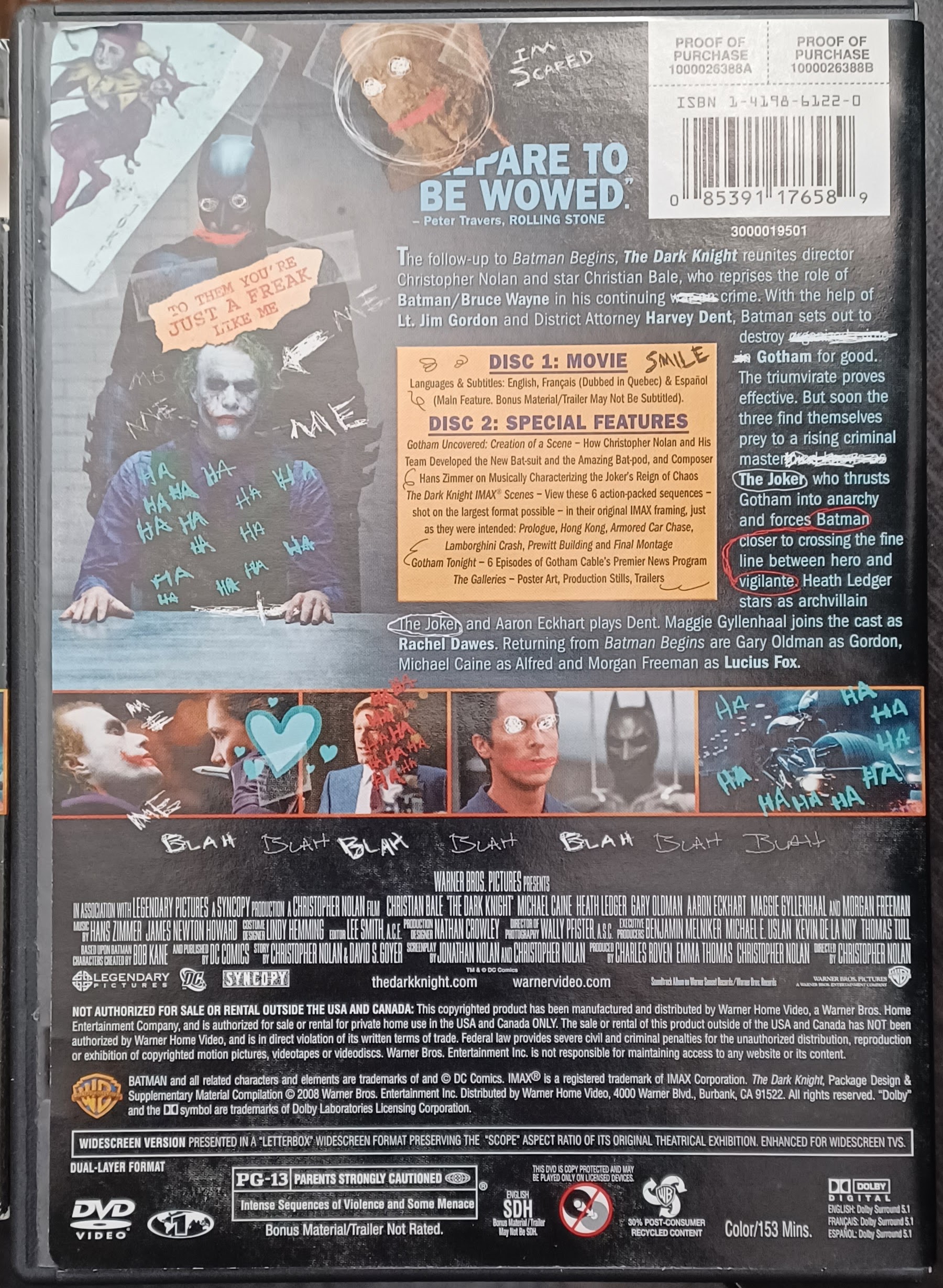 The Dark Knight is an exceptional example of doing something creative with its back cover. The one I own has a sleeve covering the actual disc cover. The sleeve is perfect and pristine, and its serious language sets a dark tone for the proceedings of the film. But in order to watch the movie, you have to remove the sleeve. Doing so reveals a nightmare underneath. The Joker has made his own modifications to the pictures and words on the actual back cover of the film. He laughs at Batman and Scarecrow, crosses out words to change the meaning of the description and frame Batman as the bad guy and the Joker as the hero of the story. He even paints “HA HA HA” over half of Harvey Dent’s face, foreshadowing what happens to him in the second half of the film.