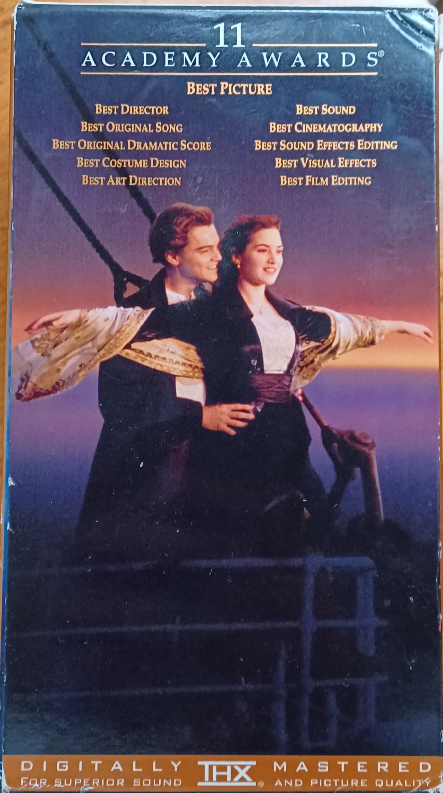 The VHS copy I have of Titanic emphasizes the 11 Academy Awards that film had recently won in early 1998, as well as the rising star of young Leonardo DiCaprio and writer/director James Cameron’s cadre of action films before they were overshadowed by the Avatar series.